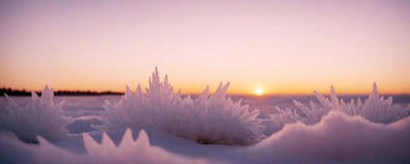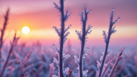The ground covered in snow and hoarfrost glistens under the warm glow of the sun, creating a breathtaking winter scene. The sparkling frost and snow provide a serene and picturesque backdrop, ideal for seasonal themes or nature-inspired designs.