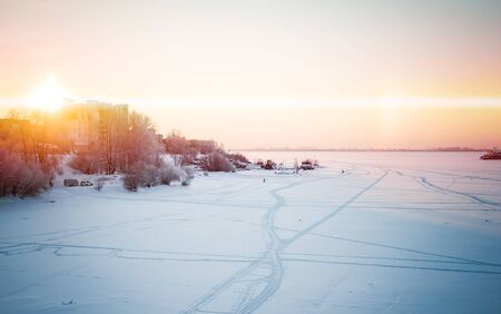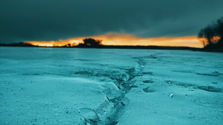 Beautiful winter panorama: landscape, a frozen river covered with ice against a sunset and an unusual sky