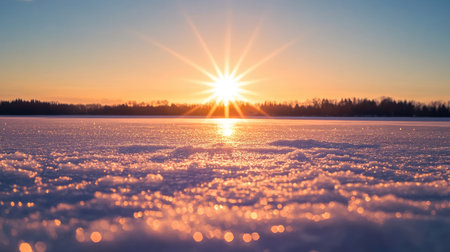 A breathtaking winter sunrise casts golden light over a frozen lake, illuminating the glistening snow. This serene landscape evokes feelings of peace and tranquility.