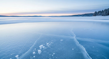 A frozen lake shows distinct cracks in the ice, revealing water beneath. The winter atmosphere is calm, with soft hues reflecting on the ice surface, highlighting the stark beauty of the season.