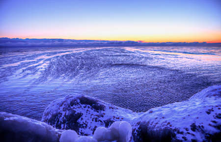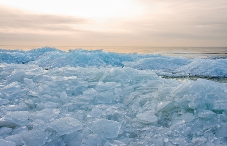 Winter coastal landscape with floating ice. Baltic sea in evening light.
