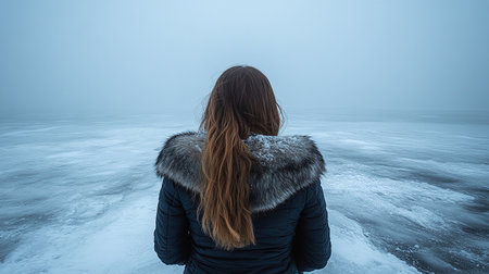 Generative AI Image of Back View of Female Wearing Jacket in Field in Snow Winter Season