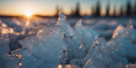 A breathtaking winter scene showcasing intricate frost patterns on ice, illuminated by the soft light of sunrise. The tranquil landscape evokes feelings of serenity.