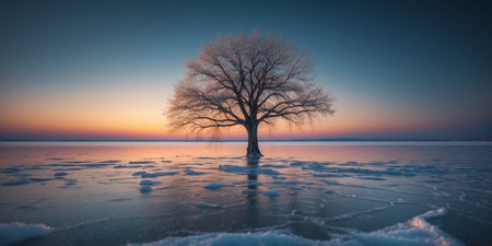 AI Generated. A tree with glowing roots growing in the middle of a frozen ocean