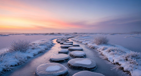 showing stepping stones path across a frozen stream in a snowy landscape at sunrise with pink and orange sky....