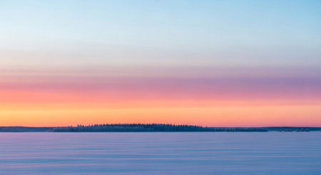 A serene winter landscape unfolds under a soft pastel sunset. The sky a gentle gradient of blues, pinks, oranges, and purples, creating a dreamlike atmosphere. A vast frozen lake stretches across the foreground, its surface subtly textured with ice and snow. A distant treeline forms a dark silhouette against the vibrant sky. The minimalist composition and soft colors evoke a sense of profound peace and quietude.