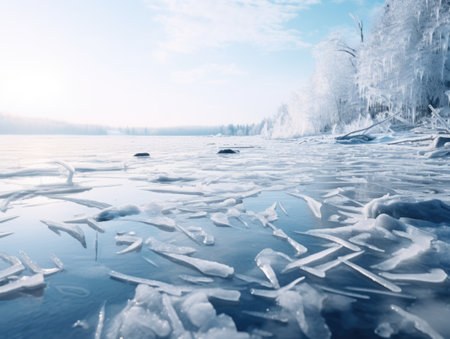 A stunning view of frosty ice forming a delicate edge on a serene water surface. The clear blue sky reflects tranquility, showcasing the beauty of winter.