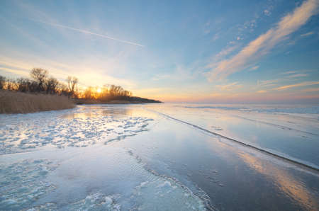 Beautiful winter sunset over the frozen lake. Ice with sunset reflections in the foreground cloudy sky winter.