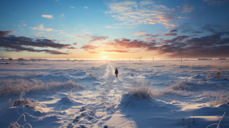 a person walks down a snow-covered path amidst fields as the sun sets, creating a surreal and post-apocalyptic atmosphere. this national geographic photo captures the beauty of the scene with its high quality and stunning colors of light amber and azure. the depth of field adds to the captivating effect, showcasing the contrasting hues of light crimson and azure. ai generated