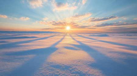 Winter sunset casting long shadows on a snow-covered field, large open space for text