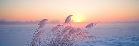 Stunning wintry sunrise over a chilly river, glistening reeds and a misty landscape in harmony