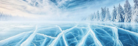 Ice and cracks on the surface of ice of Frozen lake under a sky in the winter background, Winter Season - Ai Generated