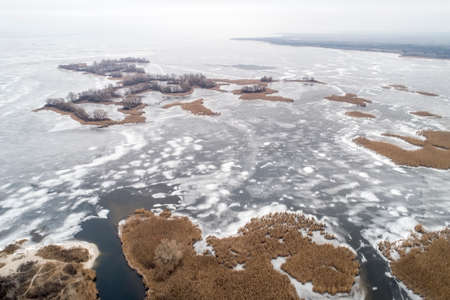 Frozen ice on the shore of the sea as a background, a bird's-eye view. Early winter