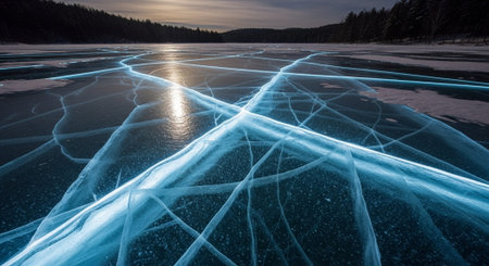 A serene frozen lake view, surrounded by majestic trees at twilight, showcasing natures beauty and tranquility