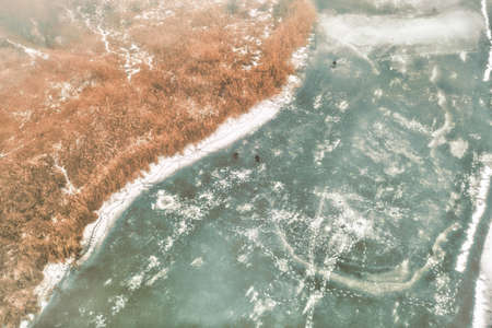 Top view of frozen lake in winter. Aerial view of frozen lake in winter.