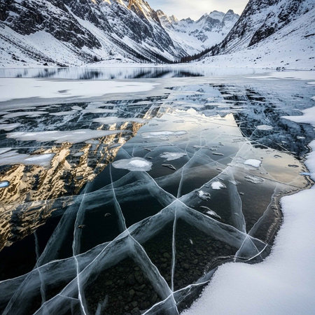 Beautiful winter landscape with frozen lake and snow-capped mountains