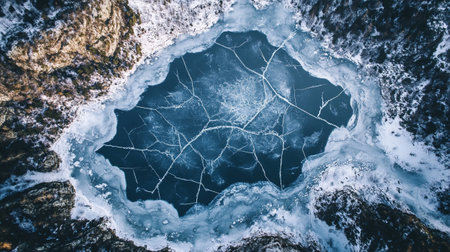 Aerial top down view over icy lake surface pattern, near Latazeris village. Winter season in Lithuania.