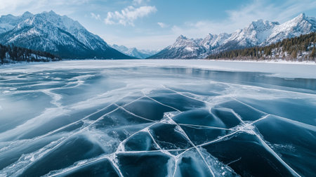 A breathtaking winter scene of a frozen lake with unique ice formations, surrounded by snow-covered mountains and pine trees under a bright winter sky.