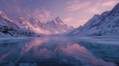 Winter landscape with frozen lake and snow-capped mountains at sunset