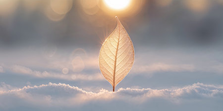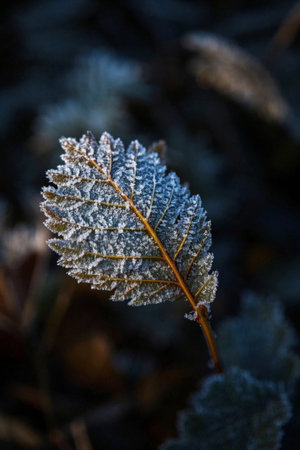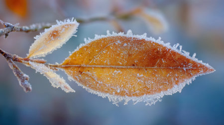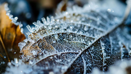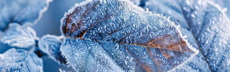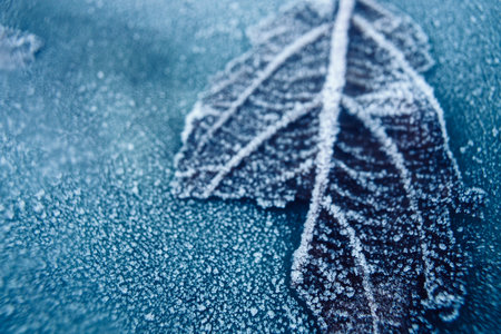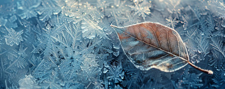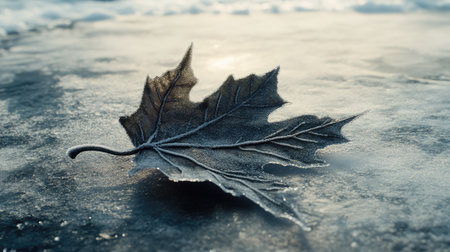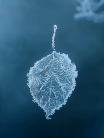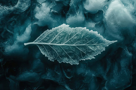 Frosted leaf placed on icy background, highlighting delicate veins and textures, surrounded by cool colors, evoking a tranquil winter scene and natural elegance