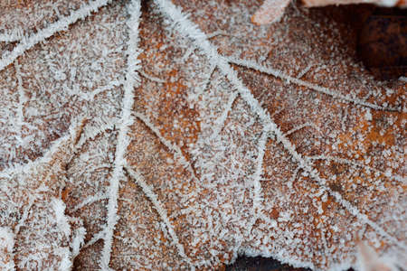 Frost covered closeup autumn leaves beautiful background. Cold weather frozen winter seasonal scene. Top view fall foliage wallpaper.