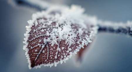 AI Generated. A mesmerizing macro perspective of frozen nature showcasing the delicate beauty of frost covered leaves