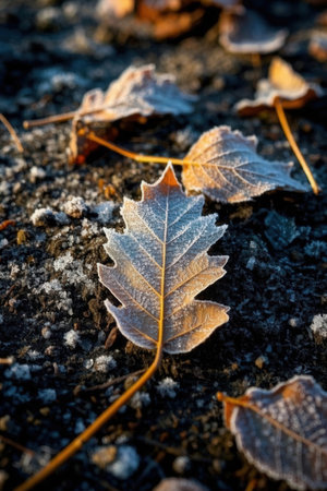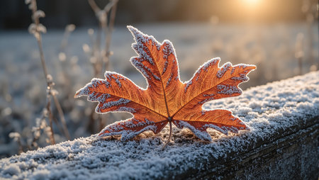 A stunning close-up of frost-covered autumn leaves catches the warm glow of sunset, highlighting the seasonal beauty and tranquility of nature's transition.