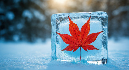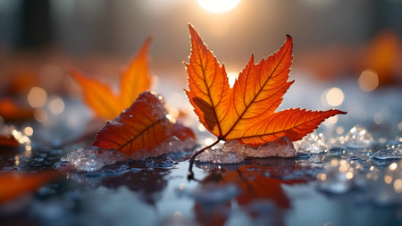 Close up shot of a vibrant maple leaf delicately resting on a glistening surface of ice, capturing the essence of late autumn transition into the winter season. The scene reflects fading sunlight, and creating a serene and artistic visual