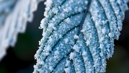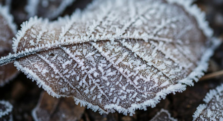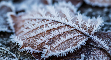 Intricate Frost Crystals Forming Delicate Patterns on Leaf Surfaces in a Beautiful Winter Scene
