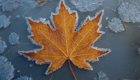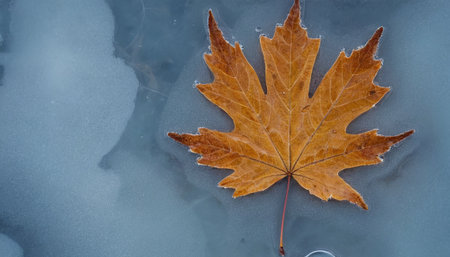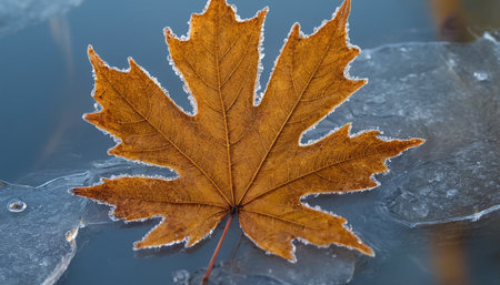 A single, vibrant golden maple leaf is captured in sharp focus, partially submerged and frozen within a layer of ice. The leaf intricate vein details and a gradient of warm orange and brown hues. Delicate frost crystals adorn its edges, contrasting with the smooth, translucent ice. The background is a soft, out-of-focus texture of frozen water, creating a serene and cold atmosphere. highlights the beauty of nature's transition into winter.