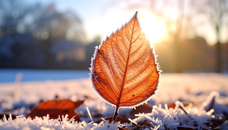 A close-up view of a leaf covered in ice crystals, illuminated by the warm glow of the winter sun. The intricate patterns of the frozen water create a beautiful and delicate design, highlighting the beauty of nature in the winter season.