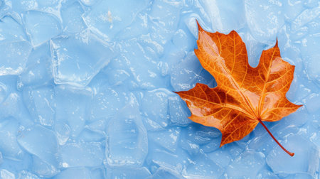 A striking orange maple leaf rests on a bed of crystal-clear ice cubes, set against a soft blue background, embodying the essence of autumn and freshness.