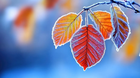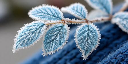 Frost-covered blue leaves in autumn, close-up view. Seasonal nature and texture concept
