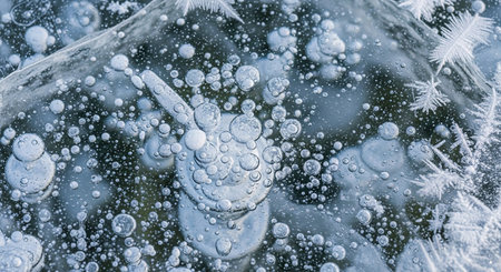 Macro view of trapped air bubbles and delicate ice crystals forming intricate patterns within frozen water