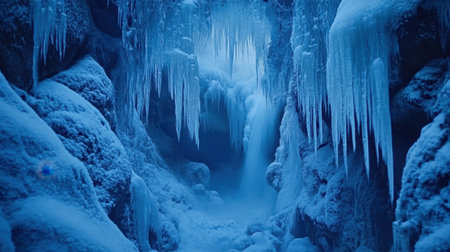 A breathtaking view of an ice cave showcasing stunning blue ice formations and a tranquil frozen waterfall, creating a serene winter wonderland atmosphere.