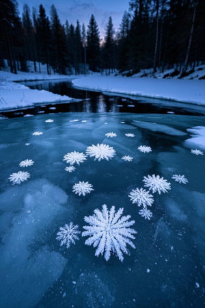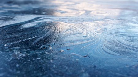 close-up of frozen river, with intricate patterns and textures visible, created with generative ai