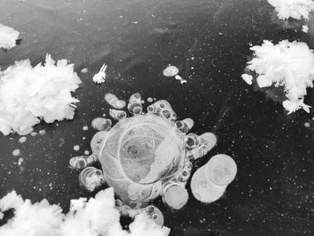 black-white patterns of air bubbles on the ice surface. Abstract background