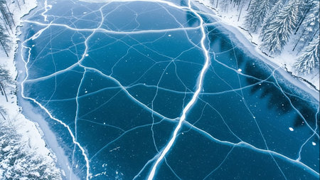 From above, the frozen river reveals intricate cracked ice patterns, photography captures the cool blues and whites