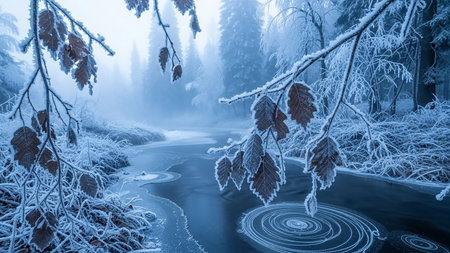 A serene winter landscape featuring a partially frozen stream winding through a frosted forest. Bare branches, still clinging to a few brown leaves, are heavily coated in frost. The scene is enveloped in a cool, blue-toned mist, creating a tranquil and slightly moody atmosphere. Intricate ice formations and swirling patterns on the water's surface add detail to this chilling natural environment.