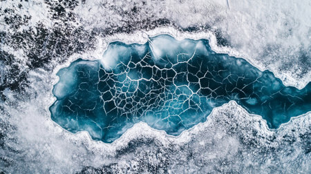 Aerial View of Cracked Ice Surface with Intricate Patterns. Concept of Natural Textures, Winter Beauty, Cold Environment, and Fragility of Nature. Banner. Background. Copy space.