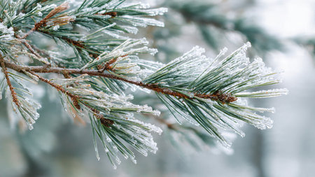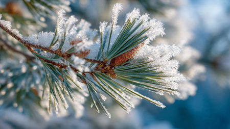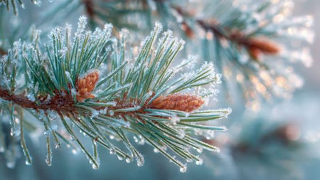 Close-up of frosty pine needles glistening with water droplets on a winter's morning