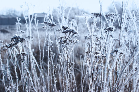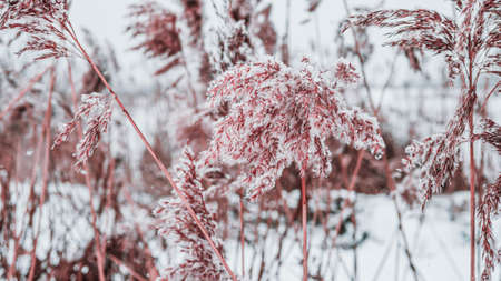 Close-up view of frost-covered plants in a winter field. Serenity and peace.