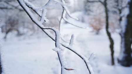 Close-up view of frosty branches adorned with delicate ice crystals, set against a misty winter landscape, creating a serene and tranquil scene.