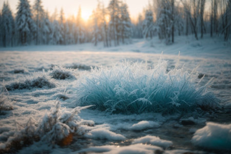 A close-up view of frosted grass with sparkling ice crystals glimmering in the early morning light, showcasing the beauty and tranquility of a winter landscape.