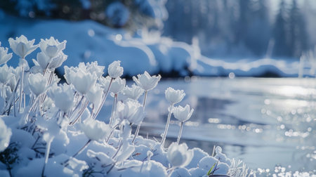 Frost flowers lining the edge of a frozen pond creating a wintery wonderland scenery