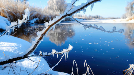 A serene winter scene featuring a frosty tree branch extending over a calm river. The icy reflection and surrounding snow create a tranquil atmosphere.