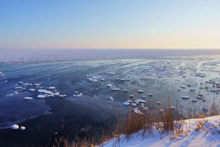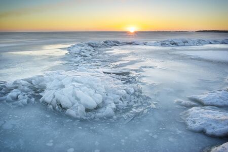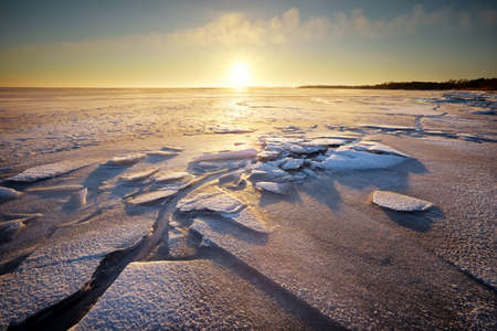 Sunset ice and snow landscape by the sea