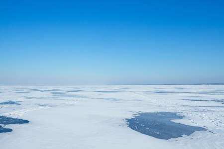 spring landscape from the lake shore, white ice cubes, blue sky, Lake Burtnieki, Latvia.