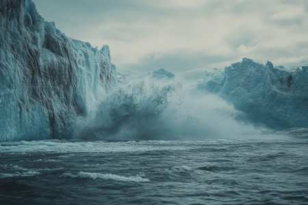 Large chunk of iceberg breaks off and crashes into dark ocean, emphasizing global warming and environmental fragility.