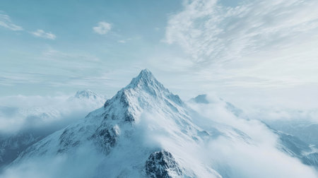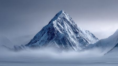 Majestic snow covered mountain peak rises dramatically against misty backdrop, showcasing beauty of nature rugged terrain. serene atmosphere evokes sense of tranquility and awe